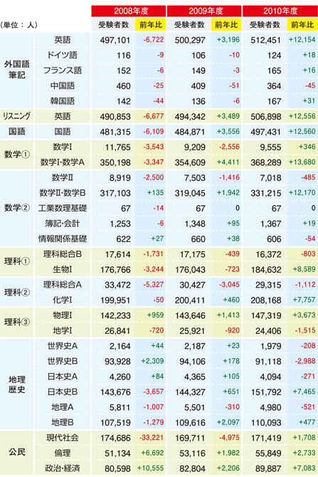| データ資料: | 「平成22年度大学入試センター試験実施結果の概要」より <独立行政法人大学入試センター> |