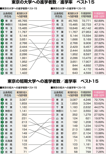 | 東京への進学者数と「大学・短大進学者のうち何%が東京に進学したか」という進学率の2つの視点から都道府県別にまとめました。 |