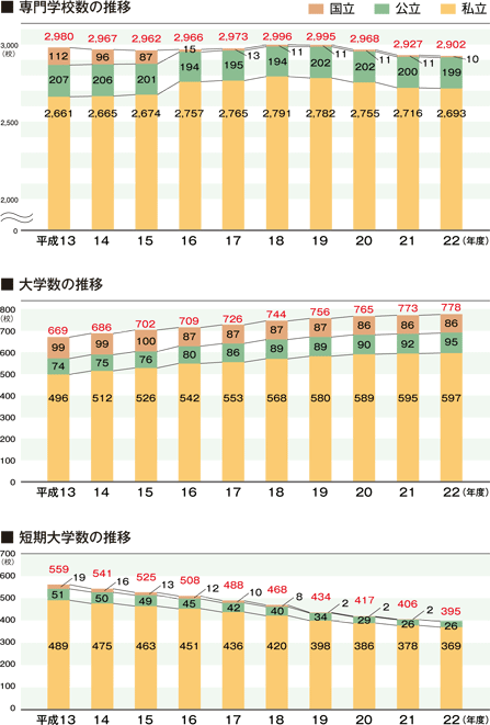 | データ資料: | 各年の学校基本調査報告書<文部科学省> ※平成22年度は、平成22年度学校基本調査速報(平成22年8月発行)より |