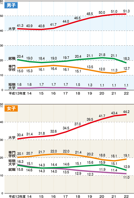 | データ資料: | 各年の学校基本調査報告書<文部科学省> ※平成22年度は、平成22年度学校基本調査速報(平成22年8月発行)より |