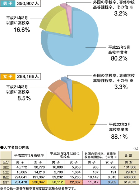 平成22年4月大学入学者のうち、同年3月に高校を卒業した学生(現役入学者)の占める割合は、男子80.2%、女子88.1%です。 |