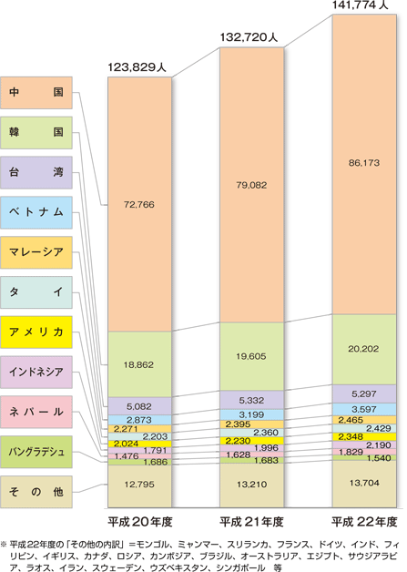 | データ資料: | 「平成22年度外国人留学生在籍状況調査結果」独立行政法人日本学生支援機構 |