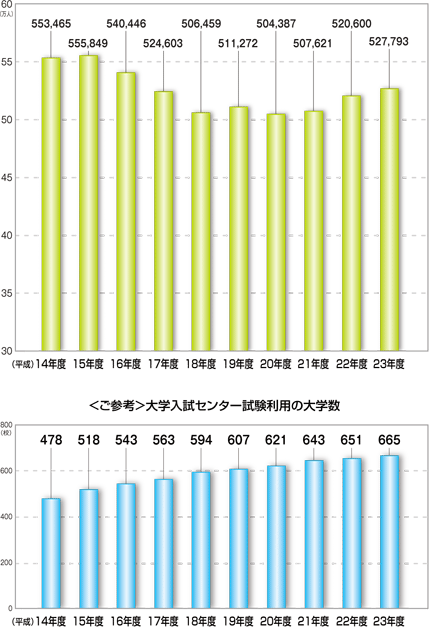| データ資料: | 独立行政法人 大学入試センターのホームページより ※受験者数については、平成23年2月3日現在のものです。 センター試験利用の大学数については、平成22年10月31日現在のものです。 (23年度は予定数) |