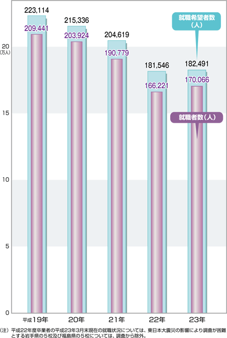 | データ資料: | 「平成23年3月高等学校卒業者の就職状況(平成23年3月末現在)に関する調査について」 <文部科学省初等中等教育局児童生徒課> |