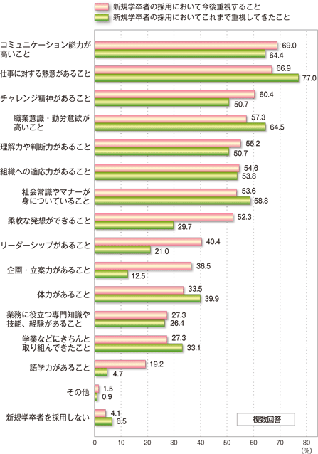 | 新規学卒者を採用する際に、どのような点を重視しているかについて調査した内容です。 |