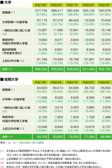 | 大学・短期大学の卒業生(男子+女子)の進路について、過去5年間の推移をまとめました。 |