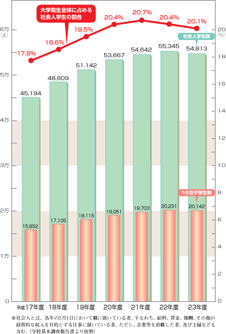 | 平成12年の「社会人学生数」調査開始以降増加し続けていましたが、平成23年度は 社会人学生数54,813人、大学院学生数に占める割合は20.1%と若干減少しました。 |