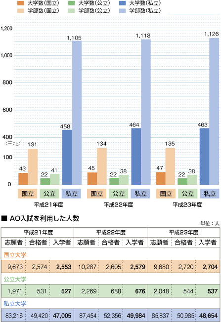 | AO入試を実施した国公私立の大学・学部数(平成21~23年度) |