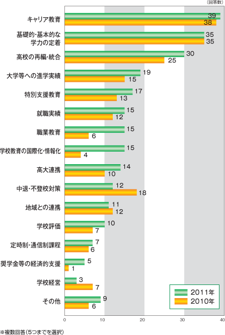 | 高等学校教育に関して、各都道府県の教育委員会が重点的に取り組んでいる課題として挙げた項目の全国合計値です。(上位5つまでを選択) |