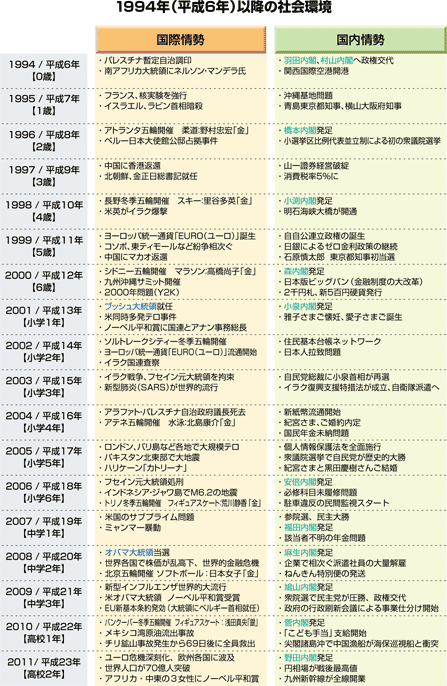 関西国際空港が開港した年に、現在の高校3年生は生まれました。彼らの育った時代背景を理解するための一助として、ご高覧いただければ幸いです。 |