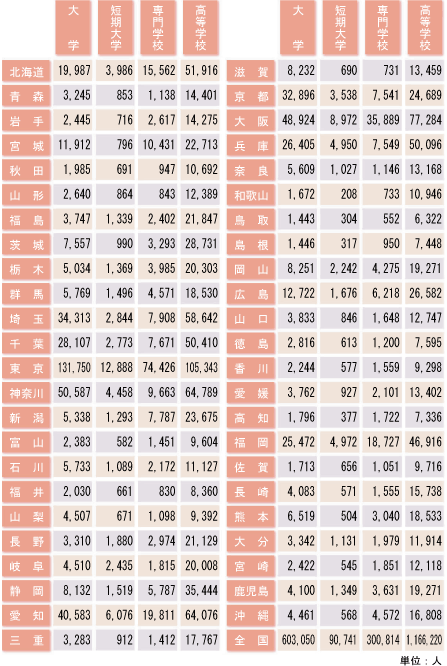 ※高等学校の数値は、平成18年5月時点で1年に在籍する学生数