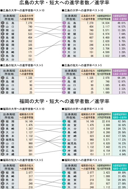 広島、福岡への進学者数と「大学・短大進学者のうち何%が広島、福岡に進学したか」という進学率の2つの視点から都道府県別にまとめました。