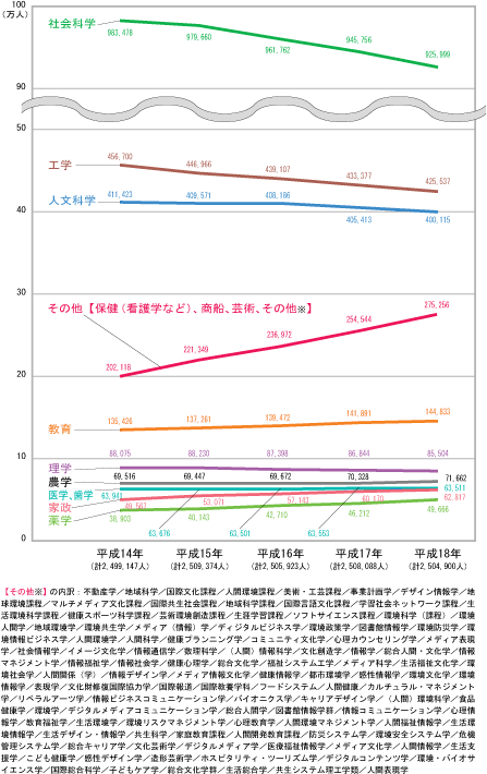 平成14年〜18年の「分野別学生数」をグラフ化しました。