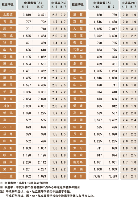 平成16年度、17年度の都道府県別高校中退率を示しました。平成16年度より17年度の方が中退率が上昇しているところが多いようです(全体では同率2.1%)。最も上昇したのは宮崎県の0.4ポイントでした。