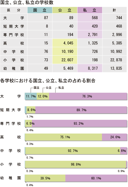 私立の学校の占める割合は、幼稚園で60.1%、小学校で0.9%、中学校で6.6%、高校で24.6%となっています。