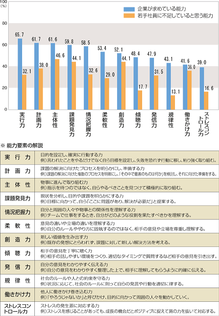 「企業が求めている能力」と「若手社員に不足していると思う能力」