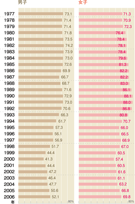 文部科学省の年次統計より、過去30年間の就職率の推移をグラフにまとめました(各年3月卒業者のうち、就職者の占める割合です)。