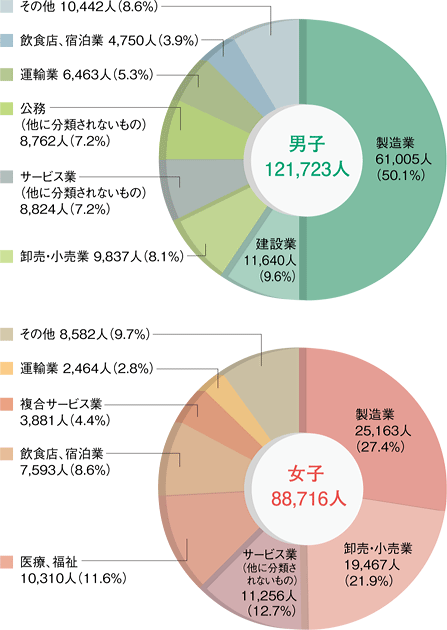 2006年3月の高等学校卒業者のうち、就職者総数は約21万人で、産業別にみると男子の場合は「製造業」についた人が最も多く、女子では「製造業」「卸売・小売業」が多くなっています。