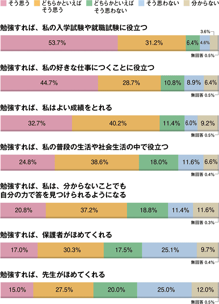 高校3年生149,753人に、勉強することによってどんな成果が得られると思うかを質問し、肯定的な回答の合計値が高い順に並べました。