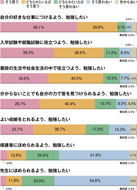 高校3年生149,753人に、どんな目的のために勉強したいと思うかを質問し、肯定的な回答の合計値が高い順に並べました。