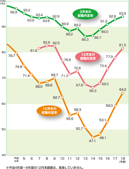 | 高等学校新規卒業者の10月末、12月末、3月末時点における「就職内定率」を、過去15年間の推移としてグラフ化しました。 |