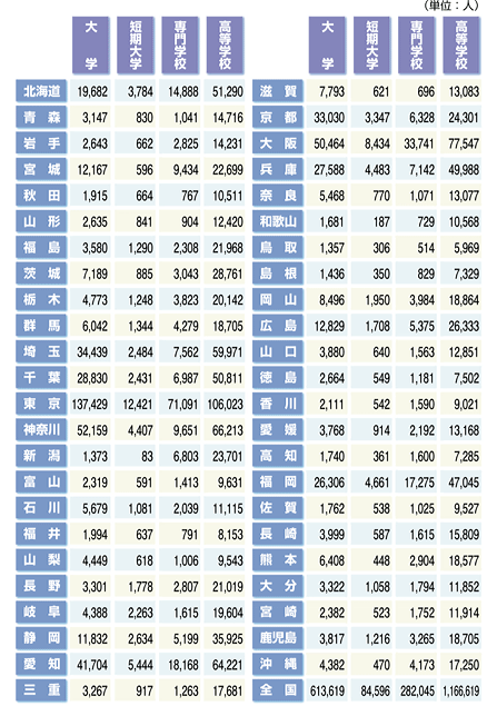 ※高等学校の数値は、平成19年5月時点で1年に在籍する学生数(全日制+定時制)