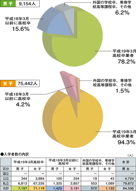 平成19年4月短期大学入学者のうち、同年3月に高校を卒業した学生(現役入学者)の占める割合は、男子78.2%、女子94.3%です。