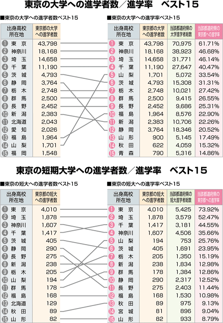 東京への進学者数と「大学・短大進学者のうち何%が東京に進学したか」という進学率の2つの視点から都道府県別にまとめました。