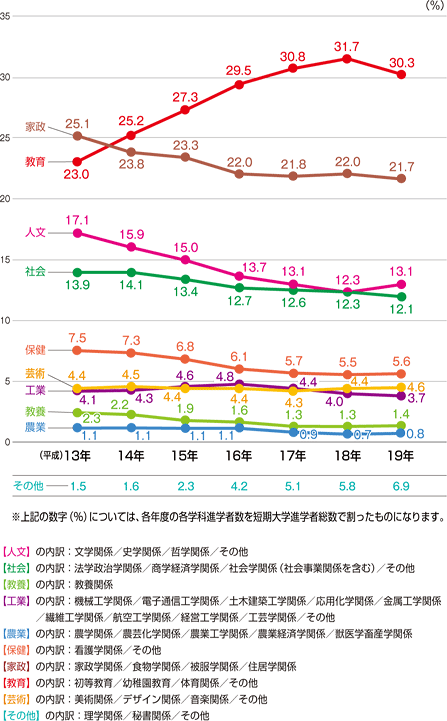 平成13年〜19年(4月入学者の学科別割合)
