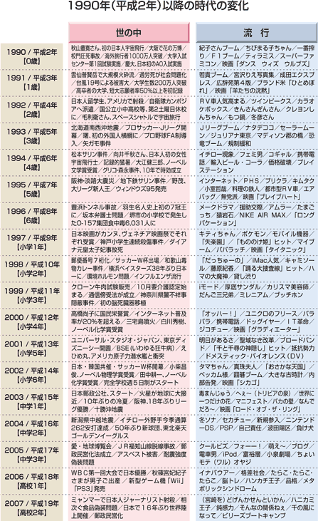 現在の高校3年生が生まれた年から、昨年までの「世の中」と「流行」をまとめました。彼らの人間像を理解するための一助としてご高覧いただければ幸いです。