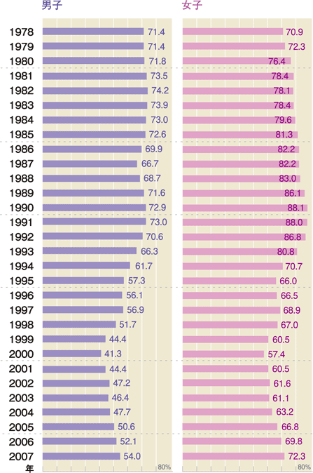 文部科学省の年次統計より、過去30年間の就職率の推移をグラフにまとめました(各年3月卒業者のうち、就職者の占める割合です)。