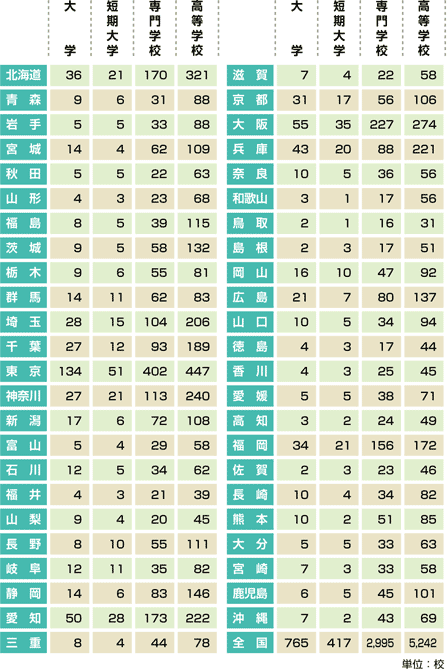 専門学校の数値のみ平成19年度学校基本調査報告書(平成19年12月発行)より
