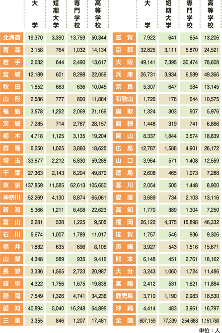 ※高等学校の数値は、平成20年5月時点で1年に在籍する学生数