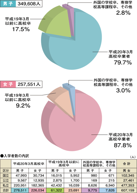 平成20年4月大学入学者のうち、同年3月に高校を卒業した学生(現役入学者)の占める割合は、男子79.7%、女子87.8%です。