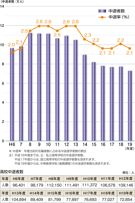 平成19年度 高等学校における中途退学者数は合計72,854人