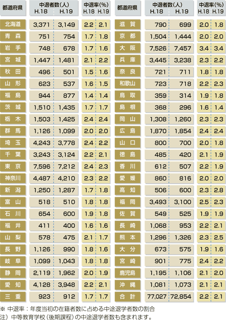 平成18年度、19年度の都道府県別高校中退率を示しました。最も上昇したのは高知県の0.5ポイントでした。