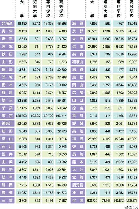 ※高等学校の数値は、平成21年5月時点で1年に在籍する学生数(全日制+