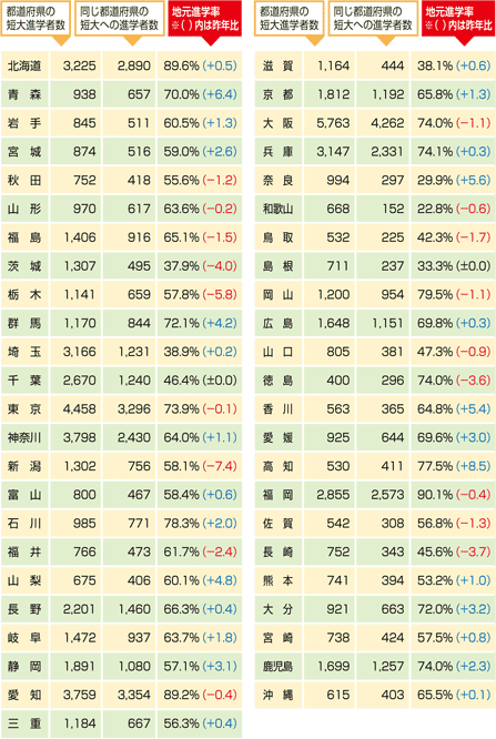 平成21年3月の高校新卒者が、出身高校と同じ都道府県の短期大学へ進学した割合です。