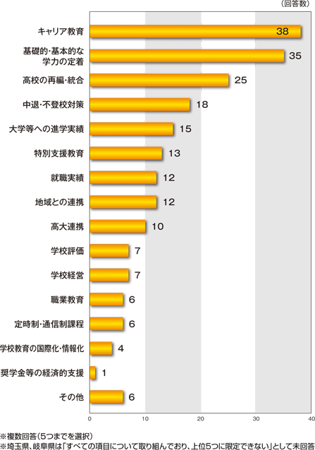 高等学校教育に関して、各都道府県の教育委員会が重点的に取り組んでいる課題として挙げた項目の全国合計値です。(上位5つまでを選択)