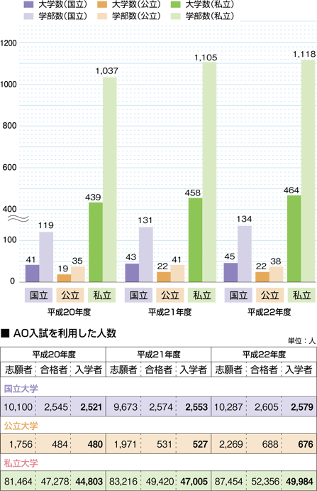 AO入試を実施した国公私立の大学・学部数(平成20〜22年度)