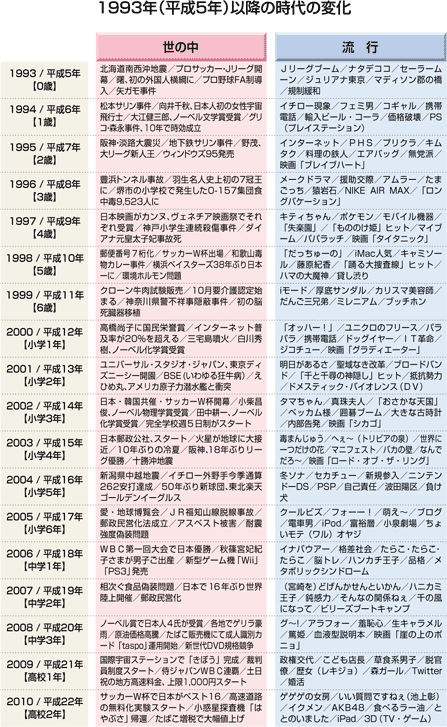 現在の高校3年生が生まれた年から、昨年までの「世の中」と「流行」をまとめました。彼らの人間像を理解するための一助としてご高覧いただければ幸いです。