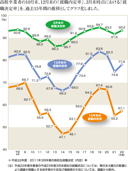 | 調査対象: | 各年度の高等学校卒業予定者で就職を希望した高校生 (平成22年10月末現在186,917人、平成22年12月末現在183,785人、 平成23年3月末現在182,491人) |