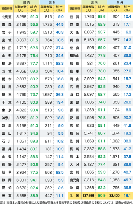 平成23年(2011年)3月高等学校卒業者(各都道府県就職者の内訳)