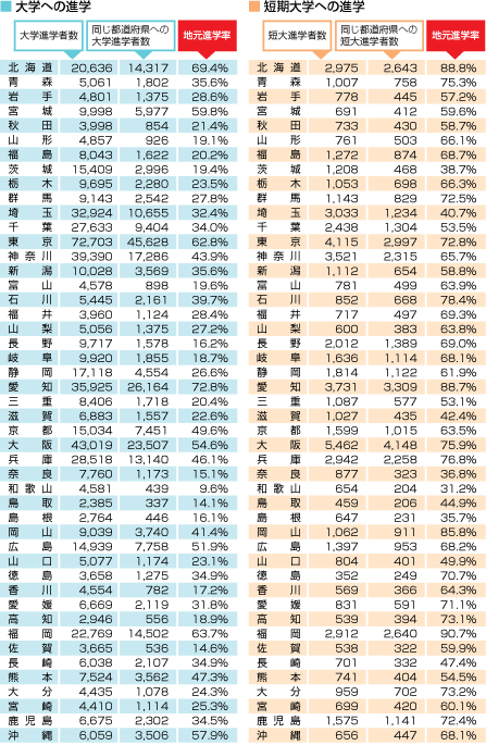 2011年に大学・短期大学へ進学した者(浪人含む)のうち、出身高校と同じ都道府県の大学・短期大学へ進学した割合です。