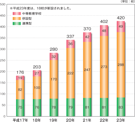| <中高一貫教育とは> 中学校3年間・高等学校3年間の制度に加えて、6年間の一貫した教育課程や学習環境を整備した制度です。 <中高一貫教育校の種類> ●中等教育学校 1つの学校として、中学校・高等学校の教育課程を実施する6年制の学校。 ●併設型の中学校・高等学校高等学校入学者選抜を行わずに、同一の設置者(都道府県、学校法人等)による中学校と高等学校を接続する学校。 ●連携型の中学校・高等学校中等教育学校との異なる点は、中等教育学校は1つの学校として設置されていますが、併設型の場合は、中学校と高等学校がそれぞれ別に設置されています。(同一の設置者による中学校と高等学校の中にも、中高一貫教育を行っている学校と、そうでない学校があります) 既存の中学校と高等学校が、教育課程の編成や教員・生徒間交流等の面で連携を深める形で中高一貫教育を実施する学校。 併設型との異なる点は、中学校と高等学校の設置者が各々異なります。 |