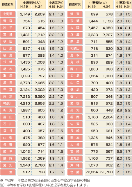 平成19年度、24年度の都道府県別高校中退率を示しました。
