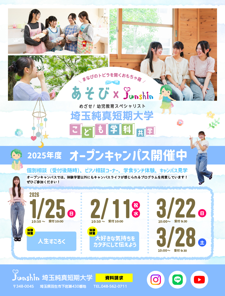 オープンキャンパス イベント一覧 すべて 来校型 オンライン型 随時 Webオーキャン 1/25(日) オープンキャンパス 埼玉県羽生市下岩瀬430 友達・保護者OK ランチ付き 参加する 2/11(祝) 建国記念の日 オープンキャンパス 埼玉県羽生市下岩瀬430 友達・保護者OK ランチ付き 参加する 3/22(日) オープンキャンパス 埼玉県羽生市下岩瀬430 友達・保護者OK ランチ付き 参加する 3/28(土) オープンキャンパス 埼玉県羽生市下岩瀬430 友達・保護者OK ランチ付き 参加する 1/25(日) オープンキャンパス 埼玉県羽生市下岩瀬430 友達・保護者OK ランチ付き 参加する 2/11(祝) 建国記念の日 オープンキャンパス 埼玉県羽生市下岩瀬430 友達・保護者OK ランチ付き 参加する 3/22(日) オープンキャンパス 埼玉県羽生市下岩瀬430 友達・保護者OK ランチ付き 参加する 3/28(土) オープンキャンパス 埼玉県羽生市下岩瀬430 友達・保護者OK ランチ付き 参加する 随時 Webオーキャン オープンキャンパスのチェックポイント Q. オープンキャンパスに行くメリットは? A. パンフレットやホームページではわからない学校の雰囲気や特徴を知ることができる。オープンキャンパスは、校舎や施設を見学し、説明を聞いたり、質 問したりすることで、学校の雰囲気や特徴を知ることができるイベントだ。興味のある学校にいくつか参加して比較しよう。 ①入学後の生活をイメージできる 学校の雰囲気が体感でき、また授業・実習を体験できるので、入学後のイメージができる。 ②疑問を解消できる 先生や在校生に、入試や授業、学生生活で気になることなどを直接質問ができる。 ③モチベーションがアップする キャンパスを見たり、授業などを体験することで受験や進学へのモチベーションがアップする。 ④入学後のミスマッチが防げる 入学後に「イメージと違った、こんなはずではなかった」と悔やまないように、入学前に学校への理解を深めることができる。 もっと見る Q. オープンキャンパスってどんなことをするの? A. キャンパス見学や体験授業、学校の説明や個別の相談会など、学校を知ることができる絶好のチャンス!オープンキャンパスは、各学校が独自に工夫を凝らしたものとなっ ている。また、友人と参加できるのはもちろん、保護者の方が同伴できるものも多く、保護者向けの説明会や相談会を同時に開催する学校も増えている。オープンキャンパスは、気になる学校をじっくりと観察できる絶好のチャンス。その主な内容を見ていこう。 ●キャンパス見学ツアー 教室、図書館、食堂、体育施設などさまざまな施設・設備を見学。在校生たちがガイド役となって、説明しながら案内してくれる場合が多い。 ●模擬授業・体験授業 講義や実習などを体験することができる。実際に行われている研究や学びの内容を知る大変よい機会となる。 ●学校説明会 学校全体の説明から、学部・学科・コースの内容説明、就職支援体制や就職実績、奨学金制度の紹介などが行われる。保護者向けの説明会を設けている学校もある。 ●入試説明会 一見複雑な入試方式の特徴やポイントを解説してくれる。入試対策のアドバイスが聞けたり、入試対策講座を実施する学校もあるようだ。 ●個別相談会 学校の担当者に、入試、奨学金、就職支援などの疑問を個別に相談ができる。また保護者向けに個別相談の時間を設けている学校もある。 ●その他 オープンキャンパスの参加が、総合型選抜(AO入試)のエントリーを兼ねていたり、オープンキャンパス会場でエントリー受付を行っていたりする学校もある。 ■タイムスケジュール例1 9:30~ 10:00~ 10:30~ 11:10~ 12:20~ 本人 受付開始 学校説明会 模擬授業 キャンパスツアー 昼食 保護者 受付開始 保護者説明会 模擬授業 保護者相談会 昼食 ■タイムスケジュール例2 9:00~ 10:00~ 10:50~ 12:20~ スクールバス送迎 説明会 キャンパスツアー・ミニ体験授業 座談会形式「先輩と話そう」 ←―――保護者相談・個別相談(希望者)――――→ もっと見る Q. オープンキャンパスに行くための事前準備は? A. 参加予約などでスケジュールを決め、パンフレットを取り寄せて学校のことを事前に調べよう! いきなりオープンキャンパス当日に学校に行って、予約が必要だった、定員が一杯だっ た…など参加できないということにならないように、参加したい学校のオープンキャンパスに事前予約が必要かを調べ、予約できる場合は予約をしておくとあわてることがないだろう。 また、たくさんの学部や学科・コースがある学校では、さまざまなプログラムを用意しているケースが多い。知りたいことや体験してみたいことを整理し、当日参加したいプログラムを決めておくと、より効率がよいだろう。 オープンキャンパスでは、先生や在校生などに質問することも可能だ。そのために、学校のパンフレットを取り寄せて、学校のことや、興味のある学部・学科・コースのことをあらかじめ調べておき、気になった点や疑問点などは手帳やノートにメモしておいて、チャ