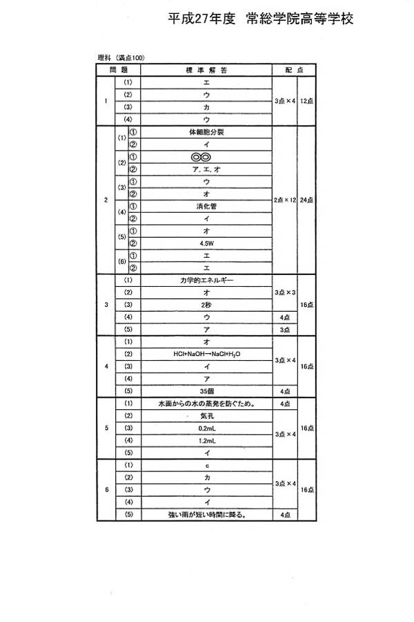 平成27年度入試過去問題(理科 解答)(1ページ目)|常総学院高等学校の入試過去問