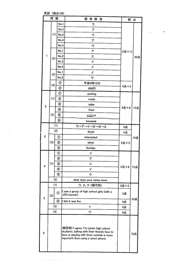 平成30年度入試過去問題(英語 解答)(1ページ目)|常総学院高等学校の入試過去問