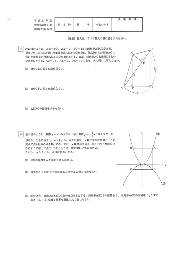 平成27年度入試過去問題 Ⅱ期(数学 問題)(3ページ目)|前橋育英高等学校の入試過去問